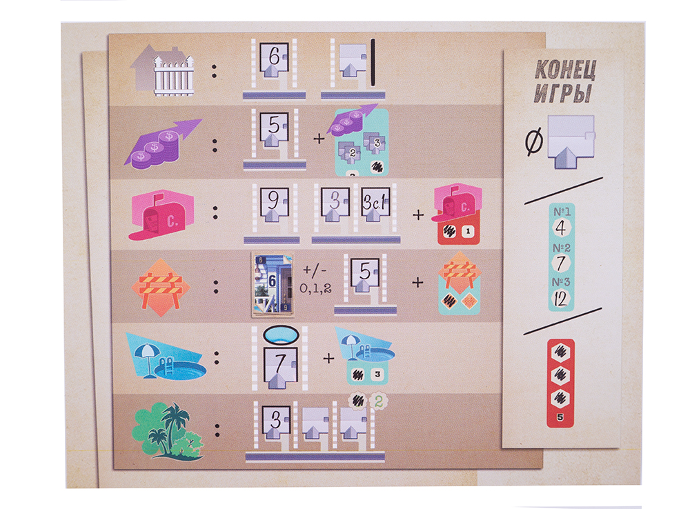 Каждый раунд выбирайте один их трёх вариантов развития. Возводите дом за домом, соблюдая логичную нумерацию. Применяйте особые эффекты. Объединяйте дома в группы. Делайте всё, чтобы именно в вашем квартале трава казалась зеленее, а небо над крышами ярче!