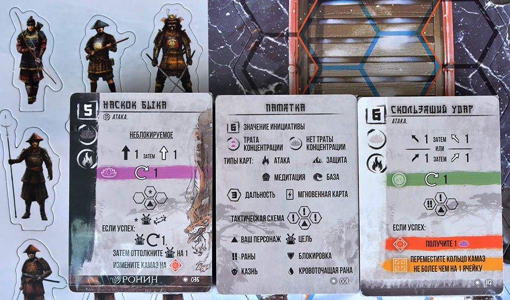Партия длится несколько ходов. Каждый игрок управляет своим персонажем-самураем. У каждого из 4 самураев из базовой коробки свои сильные и слабые стороны.