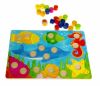 На деревянных основаниях изображены четыре обычных вида из жизни - дома, на сельском дворе, в аквариуме и у озера. На каждой дощечке вырезано 15 свободных выемок.