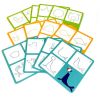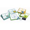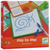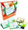 В набор входит 24 карточки, на которых поэтапно нарисованы различные изображения: животные, рыбки, птицы и другие существа. В комплекте есть также доска для рисования и фломастер. Ребенок должен будет воспроизвести изображение на доске согласно карточке с заданием. Небольшой текстильный лоскут позволит стирать изображение с доски и рисовать снова и снова.