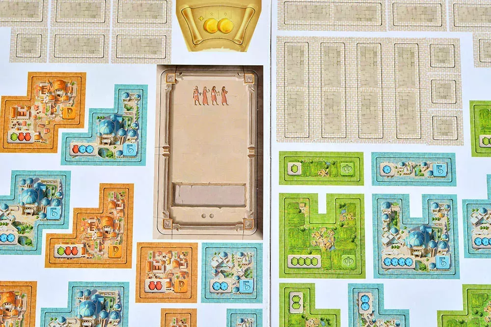 - 25 фишек ресурсов (5 фишек золота, 5 фишек населения, 5 фишек еды, 5 фишек керамики, 5 фишек механизмов)