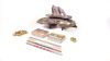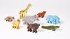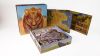 - Деревянные фигурки: 3 льва, 3 леопарда, 3 крокодила, 3 шакала, 3 гиены, 3 грифа, 3 жирафа, 3 слона, 3 носорога, 3 газели, 3 гну, 3 зебры, 8 фишек камер по 2 на игрока, фишка раундов в виде птицы-носорога