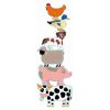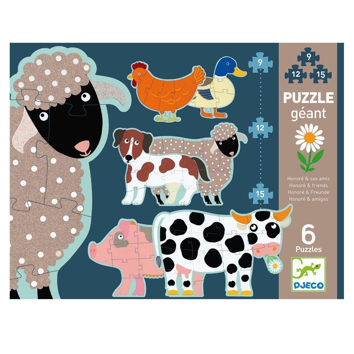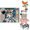В наборе ребенок найдет красочные детали, с помощью которых он должен собрать 6 животных. Картинки отличаются уровнем сложности: две фигурки собираются из 9 деталей (первый уровень сложности), еще 2 – из 12 деталей (второй уровень сложности) и еще 2 – из 15 деталей (третий, наивысший уровень сложности). Потом пазлы с животными можно сложить по вертикали и получится полноценная картина. Собирая пазл, ребенок узнает, какие животные живут на ферме.