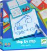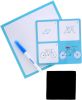 В набор входит 24 карточки, на которых поэтапно нарисованы различные изображения: транспорт, домики, человечки и многое другое. В комплекте есть также небольшая доска для рисования и фломастер. Ребенок должен будет воспроизвести изображение на доске согласно карточке с заданием. Небольшой текстильный лоскут позволит стирать изображение с доски и рисовать снова и снова.
